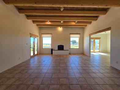 The living room is a focal point with high ceilings, vigas, and a central fireplace, while a second fireplace creates a cozy atmosphere in the primary bedroom. A third fireplace is located in the back courtyard, perfect for outdoor entertaining. The home has been freshly updated with a newly repainted interior, new carpet in the bedrooms, new window coverings, and a new roof. For your comfort a ductless a/c system has been newly installed.