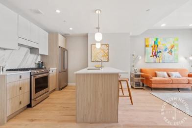 Sun-filled new construction 1-bedroom with a private balcony, shared rooftop and available PRIVATE PARKING!This modern apartment featuring oversized windows, beamed ceilings, wide-plank oak floors, and recessed lighting. Open-concept kitchen with custom wood cabinetry, Arctic White Quartz countertops, marble tile backsplashes, and high-end new appliances including a KitchenAid refrigerator and gas range and a Bosch dishwasher. Bathroom features Italian tiles, custom millwork, Kohler fixtures, plenty of storage and a deep bathtub for your enjoyment. Additionally, the unit includes a convenient in-unit washer and dryer. Amenities include a roof deck with panoramic views of Manhattan skyline and Brooklyn, package room, virtual doorman, bicycle storage, and available private parking for an additional fee. Perfectly located near Fifth Avenues vibrant dining and shopping, Prospect Park, Industry City, and multiple subway lines, this apartment offers a convenient and sophisticated lifestyle in Brooklyn.