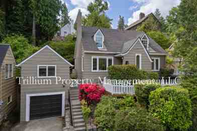 Beautiful and impeccably remodeled southwest home featuring 3 bedrooms upstairs, large office/library downstairs, huge finished basement, spa like bath, separate studio with kitchen and bath over garage, fenced in deck, small front yard, gas fireplace. Close to OHSU and backing up to Marquam Nature Park. Central AC, lovely vintage built ins, hardwoods, window seats, newer high end finishes throughout. One car garage. Nonsmoking property, landlord pays for landscape maintenance and garbage, two small (under 20 lbs, no exceptions) pets welcome. No new dogs during a tenancy.