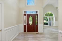Experience waterfront living in this spacious home, available for immediate move-in. The large open floor plan is enhanced by fresh paint, new luxury vinyl plank flooring, and updated light fixtures, creating a modern and inviting atmosphere throughout. The main level features a welcoming living room, a comfortable family room, a formal dining room, and a bright breakfast nook—offering versatile spaces for relaxing, entertaining, and everyday living. All four bedrooms and laundry room are conveniently located on the second level. The primary bedroom is a true retreat, featuring a walk-in closet with direct access to the laundry room, a large soaking tub, separate shower, double sinks, and water views. The three additional bedrooms are generously sized, providing plenty of space for family, guests, or a home office. This