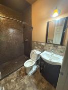 A remodeled bathroom with tile floors and floor-to-ceiling tile in the shower