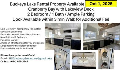 Amazing 2 bedroom, 1 bathroom house in Buckeye Lake. Amenities included: central heat, deck, dishwasher, stainless steel appliance, updated kitchen, updated bathroom, washer dryer, and yard. Lake Get-Away - Completely Renovate! Ample off-street parking for you and guests! Large backyard with grass and patio. Dock available (extra monthly fee) within 3 min walk. No Utilities included. Is pet friendly. Date Available: Oct 1st 2025. $1,595/month rent. $1,595 security deposit required. Please submit the form on this page or contact H C Cranberry Properties at 614-668-3245 to learn more. This property is managed by a responsible landlord using Avail landlord software.