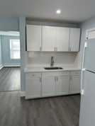 Completely renovated kitchen with quartz countertops, vinyl floors, and space for meal prep and storage