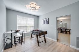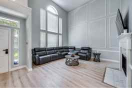 This two-story house offers a roomy, relaxed layout with five full bedrooms and two and a half baths, spread over 2,640 square feet. It's set on a corner lot in a cul-de-sac, which adds peace and privacy. Inside, you'll find updated laminate floors throughout and a layout made for both hanging out and having guests over. The living room features an oversized sectional couch, a smart TV, a coffee table, and an ornamental fireplace that adds enough character without fussiness.