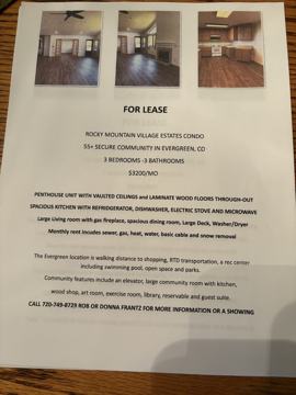 Age restrictedPenthouse, 55+ secure community. 3 bedroom, 3 bathroom condo in Evergreen. Amenities included: wheelchair accessible, balcony, central heat, deck, dishwasher, hardwood floors, updated kitchen, updated bathroom, storage, and washer dryer. Utilities included: cable, heat, gas and water. Is not pet friendly. Date Available: Oct 1st 2025. $ 3,200 month rent. Please submit the form on this page or contact Rob Frantz at 720-749-8729 to learn more. This property is managed by a responsible landlord using Avail landlord software.