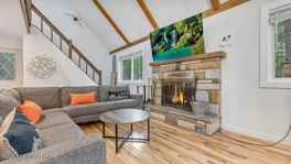 Cozy chalet in the highly sought-after Locust Lake Village community. This home underwent a complete gut renovation in 2022 and blends rustic charm with modern upgrades. Soaring vaulted ceilings with exposed beams create an open, airy feel, while wood cabinetry, granite countertops, and stainless steel GE appliances add a touch of elegance to the kitchen. Oak hardwood floors throughout, two new bathrooms with stone flooring. Upgrades include Hype Heat Mitsubishi split units,