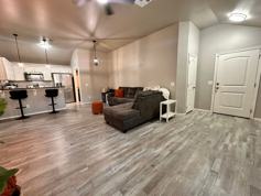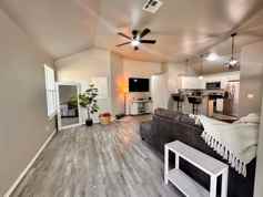 This 4-bedroom, 2-bathroom home features an open floor plan with high ceilings and spacious living and dining areas. The kitchen offers granite countertops and [appliances include: stove, refrigerator and microwave]. A separate laundry room adds convenience.