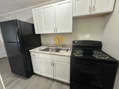 The kitchen features plenty of cabinet space, a double-sided sink, and comes equipped with a refrigerator and electric stove. The bedroom offers a full bathroom that includes a clean bathtub/shower combo.