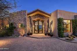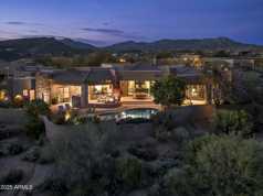 Nestled in Sunrise Village, this beautiful home sits at the end of a quiet cul-de-sac and surrounded by multiple mountain views. As the day unfolds, enjoy stunning painted-sky sunsets and twinkling city lights. Designed for entertaining, the floor plan features a wet bar, wine closet, and seamless living and dining areas. The oversized stack slider extends the space outdoors for alfresco dining. A desirable split-bedroom layout ensures privacy for the homeowner. The backyard is an oasis of outdoor living with multiple patios, including an extensive covered area, a stone fireplace, sparkling pool, with a spa and cascading waterfalls and a built-in BBQ.