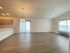 This unfurnished rental home features an open floor plan, stylish vinyl plank floors, modern stainless steel appliances, a gas range, and vaulted ceilings.