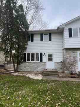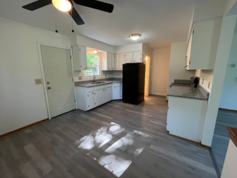 This 4 bedroom end unit has a front door that enters into the living room and a back door that enters into the dining and kitchen. It has a 1/2 bathroom next to the kitchen and the top of the stairs that lead down to the basement.