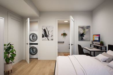 Every apartment is fully furnished and features stainless steel appliances, an in-unit washer and dryer, and floor-to-ceiling windows that flood your space with natural light.