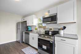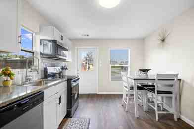 The space is a bright, fully furnished one-bedroom, one-bathroom unit converted from a workshop. It features a modern kitchen with stainless steel appliances, granite counters, and a dining area. The living area is comfortable with a smart TV and workspace. There is a cozy bedroom with storage and a full-size washer and dryer for convenience. Wood-look flooring enhances the clean, modern feel of the unit, making it ideal for travelers or professionals on extended stays.