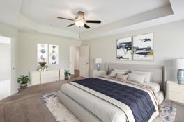 The spacious primary suite features a huge walk-in closet and private bath with double vanities, separate shower, soaking tub, and linen closet. Additional highlights include a covered front entrance, two-car side-entry garage, and wooded backyard.