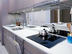 This three years' new air conditioned home offers a practical floorplan which can be flexibly rearranged to suit your needs. With moveable wall panels and storage closets, you can have open living space or a closed off room - whatever you prefer! The kitchen offers integrated appliances and the island has an extendable dining table that can be put away when not in use.