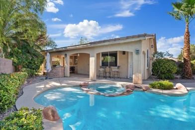 In the Gardens of South Summerlin * Updated 3 On-Suite Beds, 3.5 Bath * Primary Bed Downstairs with Access to the Backyard * Beautiful Backyard w/Pool & Spa, Covered Patio * Brand New Built-in BBQ * Open Floor Plan * Kitchen w/Granite Counter Tops and Pantry * Pets Welcome * Close to I215, Parks and Shopping!