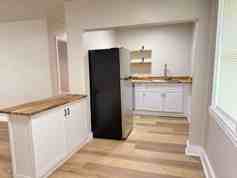 Refreshed Kitchen: Features new butcher block countertops, updated cabinetry, and new fridge and stove.