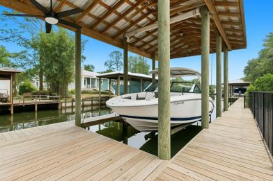 Waterfront home off Buck Bayou with private boat house with a lift - large enough to accommodate a 35ft boat plus a jetski lift. Sprawling at just under 4,000 soft this house is perfect for large families - the main house has three bedrooms plus an office and an attached carriage house has a full living room and kitchenette on the main floor and a private bedroom and full bathroom on the second level. Whole-house powered solar panels means your power bill will be next to nothing. Perfect for entertaining, a 45ft deck with a gas fire pit all leads to the water. Hop on your boat or jetski or take a paddle board out in the calm Bayou. Oversized two-car garage with plenty of driveway parking. Separate garage gym with foam flooring for fitness enthusiasts. Minutes from Sacred Heart Hospital