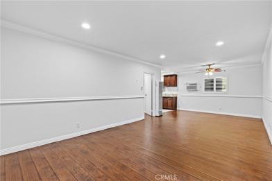Welcome to this stylish and move-in ready one bedroom, one bathroom condo offering approximately 800 sq ft of comfortable living space in a well-maintained complex. This bright unit features wood-look flooring throughout, crown molding, recessed lighting, and ceiling fans in both the living room and bedroom. Enjoy cooking in the upgraded kitchen, complete with stainless steel appliances, granite countertops, and rich cabinetry. The open-concept layout flows into the dining area and spacious living room, perfect for entertaining or relaxing. Step outside to your private balcony, ideal for enjoying fresh air. The community also offers access to a sparkling shared pool, perfect for sunny days.