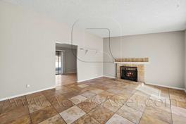 The living room is bright and welcoming, featuring large windows and a cozy fireplace—perfect for relaxing evenings. Just beyond, the kitchen and dining room flow seamlessly together. The kitchen offers a peninsula/bartop counter, plenty of cabinets for storage, and direct sightlines into the dining area. From here, a sliding glass door leads to the fenced backyard, where you’ll enjoy a covered patio ideal for outdoor dining or simply enjoying the fresh air.