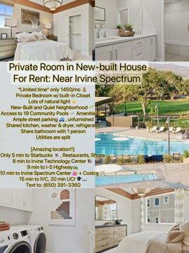Private Room in New-built House in Irvine *Limited time* only 1450/mo Private Bedroom w/ built-in Closet Lots of natural light New-Built and Quiet Neighborhood Access to 19 Community Pools + Amenities Ample street parking &, unfurnished Shared kitchen, washer & dryer, refrigerator Share bathroom with 1 person Utilities are split [Amazing location!!] Only 5 min to Starbucks, Restaurants, Shops 8 min to Irvine Technology Center 9 min to 1-5 Highway 10 min to Irvine Spectrum Center + Costco 15 min to IVC, 20 min UCI Text to: (650) 391-3360