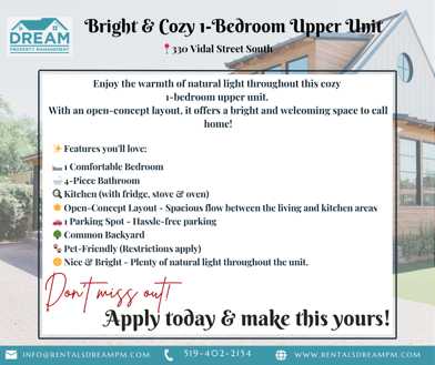 Enjoy the warmth of natural light throughout this cozy 1-bedroom upper unit. With an open-concept layout, it offers a bright and welcoming space to call home!