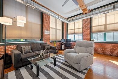 Inviting & spacious unit! This stunning home features high ceilings, large windows for plenty of sunlight, beamed ceilings and exposed brick walls. The open floor plan creates an inviting atmosphere, perfect for both relaxing & entertaining, it includes a kitchen with granite countertops, stainless steel appliances, a gas range, and kitchen island, a dining space and a living room. The bedroom has a large closet, ceiling fan, & bathroom access. This unit offers central air, gas heating, a laundry room and a welcoming entry hallway. The complex offers a secure lobby, fitness center, peaceful courtyard, as well as designated parking. Imagine the possibilities for creating a stylish and comfortable living space that reflects your personal taste! Conveniently located near grocery stores, shopping, public transport, and major highways.