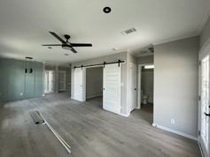 The primary bedroom suite offers tranquility and convenience with its two generously sized walk-in closets and an en suite bathroom featuring a rainfall ceiling shower head, glass barn shower doors, and floating base cabinets with under-cabinet lighting surrounding a double vanity sink.