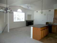The home features central air conditioning, a gas fireplace, and ceiling fans throughout. The open-concept design connects the living room, dining area, and kitchen, creating a bright and functional living space. The kitchen includes generous cabinetry and counter space, ideal for everyday use and entertaining.