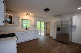 The kitchen has been fully updated with crisp white cabinetry, sleek black hardware, stainless steel appliances, and plenty of counter space for cooking. A sliding glass door leads to the expansive back deck, ideal for entertaining or relaxing while overlooking the tree-lined yard.