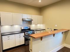 Inside, you’ll find a well-equipped kitchen with granite countertops, a dishwasher, and an oven. The apartment features recessed lighting throughout the kitchen, living room, and bedroom, creating a warm and inviting ambiance.