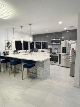 Modern 3BR/2.5BA single-family pool home in Miami (33157). Features a gourmet kitchen with quartz counters, tile island, stainless steel appliances, and pendant lighting. Spacious primary suite with pool views, patio access, and custom walk-in closet. Bathrooms include LED mirrors and spa-style finishes. Open layout with porcelain tile flooring and recessed lighting throughout. Property is renovated completely.
