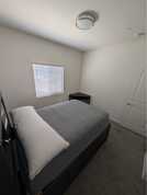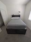 Bright west-facing room with a nice view of the front courtyard and street. Comes with a queen or twin bed frame (your choice) and a double sliding-door closet with shelving.