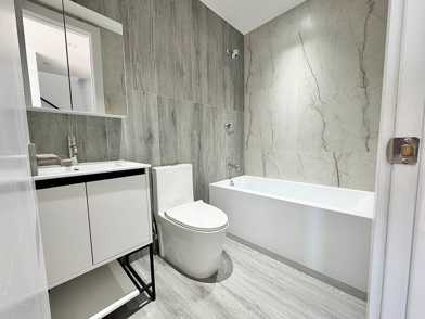 It is spacious enough to easily fit a queen-sized bed and a large bureau. The windowed bathroom showcases grey tile with black trim and includes a shower/tub combo. There is also a large mirrored medicine cabinet and additional glass shelves for storage.