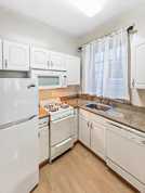 This one bedroom apartment has updated kitchen and bath. Open concept floor plan - living room is open to the kitchen with French doors to the bedroom. The kitchen features granite counters, lots of cabinet space, and all appliances (fridge, gas range, microwave, dishwasher & disposal). 3/4 bathroom (shower only). Hardwood floors throughout.