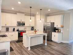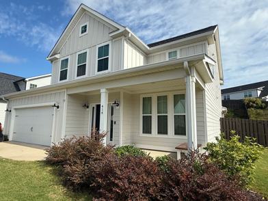 Welcome home to this beautiful two-story property offering 4 bedrooms, 3.5 bathrooms, and approximately 2,472 square feet of living space. The home features an open-concept layout with luxury vinyl plank flooring throughout the main level, neutral paint tones, and plenty of natural light. The entryway welcomes you with a two-story foyer and a formal dining room accented by coffered ceilings and custom wall trim for added farmhouse charm. The kitchen is a showstopper, complete with white cabinetry, granite countertops, stainless-steel appliances, a farmhouse sink, a large island, and a walk-in pantry. The kitchen opens seamlessly to the breakfast area and the spacious living room, which includes a cozy electric fireplace with a shiplap accent wall. Upstairs, you’ll find all four bedrooms, including a large owner’s suite with a private bathroom featuring a double vanity with granite counters, a soaking tub, a tiled shower, and a separate water closet. The secondary bedrooms are well-sized, with one offering its own private full bath, while the remaining two share a hallway bath with double sinks. A conveniently located upstairs laundry room provides easy access for all bedrooms. Enjoy outdoor living on the covered rear patio overlooking the backyard — perfect for relaxing or entertaining. Additional highlights include a covered front porch, rod iron details on the staircase, a two-car garage, and plenty of storage throughout.