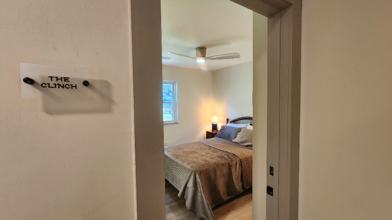 The Clinch is an expanded upstairs bedroom with full bed, desk, double nightstands, and Roku TV in a remodeled Knoxville home for travel medical professionals. Semi-private bath with large shower, single vanity & 2 bath linen sets. Sound-insulated walls, keypad lock, ceiling fan, linens included. Access to kitchen, laundry & living areas. Property Overview: http bit ly 4o2AF6O