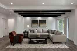The sunlit living room highlights dramatic exposed wood beams and luxury vinyl plank flooring, with sliding glass doors opening to a spacious patio and deck—perfect for relaxed gatherings or effortless entertaining. The renovated kitchen and bathrooms feature custom fixtures, stone countertops, and handcrafted vanities, balancing contemporary finishes with the home’s original architectural character.