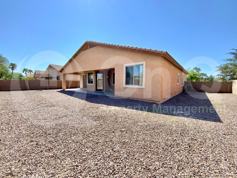 Experience refined living in this beautifully appointed 3-bedroom, 2-bath + den home on an expansive corner lot. Thoughtfully designed with open living spaces, designer tile, granite countertops, and upscale finishes throughout, this residence offers both sophistication and comfort. The gourmet kitchen flows seamlessly into the great room with a charming fireplace and abundant natural light. The primary suite features private patio access, ideal for quiet mornings or starlit evenings. Outdoors, enjoy a covered patio surrounded by mature landscaping, creating the perfect setting for elegant entertaining or serene relaxation. Located in the prestigious Gladden Farms community—close to premier parks, dining, and shopping—this home embodies the best of modern desert luxury