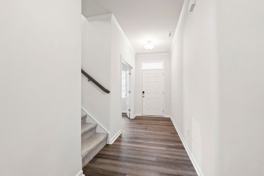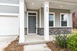 The exterior features neutral siding, stone accents, a covered front porch, and a two-car garage. Inside, a luxury-vinyl flooring leads through an inviting entry into the open-concept living and kitchen areas, filled with natural light and recessed lighting.