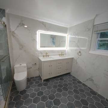 Luxury bathroom with double vanity, LED mirror, high grade hexagon tile, floor to ceiling marble type wall tile, new LG washer & dryer, & brushed gold fixtures.