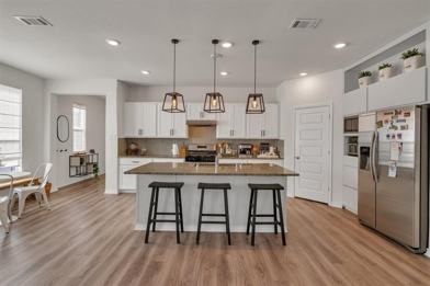 Beautiful, single story home features a brick exterior situated on a corner lot. Inside, discover an open floor plan with 9’ ceilings. The kitchen showcases 36” upper cabinets, granite countertops, a large island, and stainless-steel Whirlpool® appliances. The appliances include a vent hood, dishwasher, and gas range. The primary suite boasts a dual-sink vanity, large walk-in closet, and a tub-shower combination with a tile surrounds. You can find three additional bedrooms with sizable closets. Other distinguishing features include luxury vinyl plank floors and a whole house sprinklers and gutter system. A covered patio overlooks the large backyard. Washer, dryer and fridge will be provided!