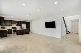 The main level features easy-to-maintain tile flooring, high ceilings, and a spacious living area that flows seamlessly into the modern kitchen. The kitchen is equipped with a large center island, granite countertops, stainless steel appliances, and ample cabinetry perfect for both everyday living and entertaining. A private patio just off the living room provides the ideal outdoor retreat.