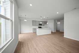 Open-concept kitchen with stainless steel appliances, quartz counters, pantry, and dining area