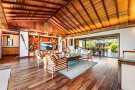 Soaring open-beam ceilings, travertine, and hardwood floors set the tone for timeless elegance. Expansive living spaces flow onto multiple covered lanais, creating effortless transitions from indoor relaxation to outdoor gathering. Natural light fills the interiors, framing ocean and garden views at every turn.