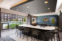 The stylish clubroom is a multi-functional space that features lounge seating, TVs, work from home booths, and a pool table