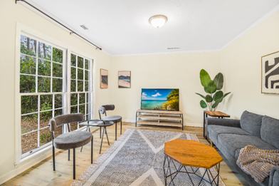 Fully furnished 2 bedroom with cozy living room, a laptop/writing table, and Smart TV. Sign into all your streaming services. Bright and roomy dining space with table and chairs can also be used as an office.