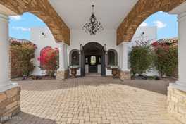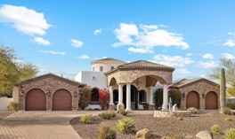 Fully custom home designed in Savona Community 6,565 square foot Mediterranean style Villa on 1.14 acres 5 bedrooms / 5 baths / 4-car garage / 1 covered parking / 16 additional driveway parking 40 ft tall circular atrium at the center with cupola encircled by windows 12 ft tall ceilings, 9ft tall doors, and beautiful travertine floors throughout entire home Circular drive with 23-foot-tall port cochere 2,581 sqft of covered, evaporative and fan-cooled covered patio Heated pool, hot tub, putting green, built-in picnic tables, large 14-seat home theatre, wet bar 9 fountains inside and outside with a 9ft tall lion fountain in the center atrium 1,100 sqft roof deck accessed by spiral staircase with 360° views of mountains, city, and wildlife 3 beautiful fireplaces in dining, living room, and primary suite 1,000 sqft primary ensuite with dual walk-in closets, dual showers, dual bidets, and large jetted tub 2 additional ensuite bedrooms and 2 bedrooms share a bathroom Huge gourmet kitchen with Frigidaire appliances, double ovens, and double stoves Large outdoor kitchen with grill, sink, small fridge, cooktop, bar, and built-in picnic tables Granite and stone countertops throughout the home Fire suppression system throughout home and security cameras Decorative concrete columns, fieldstone finishes, and concrete window popouts Multi-tiered and coffered decorative ceilings throughout home Beautiful, arched double hardwood doors at front and rear entry 3 chandeliers lighting the front patio, central atrium, and back staircase Ceiling fans in every living area and bedroom Mature landscaping with automated programmable sprinkler system, front and back Large picture windows featuring fountain and pool views Reverse osmosis water and water softener Dual hot water heaters, Washer/Dryer, Central vacuum, Dual pane windows Dual garages with epoxy floors and built-in storage Built-in speakers and wiring throughout including bedrooms, patios, and living areas