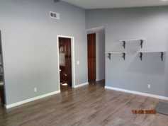 Modernized one story Harris home with inground pool and spa. This home offers 1134 sq. ft. and was built in 1985. Stylish laminate wood flooring and custom window coverings throughout the entire home. Comfortable living room with brick fireplace and built in shelves. Upgraded kitchen with granite countertops, new cabinets and stainless-steel appliances. Appliances include dishwasher and new gas range (to be installed). Both bathrooms have new vanities and custom tiled showers. Master bedroom has mirrored closet doors built in organizer and ceiling fan. Gas laundry hookups in the garage. Private backyard with covered patio and inground pool and spa. Owner prefers no pets but will consider subject to owner approval with an additional pet deposit to be determined. Owner pays for trash, pool and gardening services. 1 year lease required.