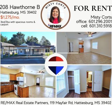| Professionally Managed By: Misty Corts, Broker Associate with RE/MAX Real Estate Partners | mobile: 601.310.5918 | office: 601.296.2001 | www HattiesburgRentals com | 119 Mayfair Rd Hattiesburg, MS 39402.
